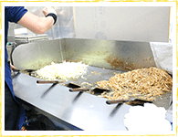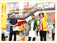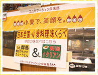 この日「ふるさと村」では【小麦フェスタ~小麦の七変化~】と題して、県内のさまざまな小麦料理店が大集結! 五目あんかけラーメン、カステラ、焼きそば、お好み焼き、ワッフル、ドーナツなどなどバラエティ豊か。 小麦がさまざまに七変化する中で「日本全国・小麦料理味くらべ!」イベントも、にぎにぎしくスタートです。 「Enjoy Comugication!」