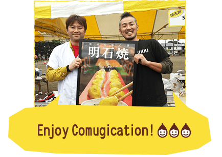 ひもかわうどん組が「食べに来てくださ~い!」と呼びかけると、「「負けへんで!がんばるで!」と応える明石焼き。会場の熱気をコムギ情報とともにレポートしました。