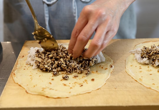 4等分にした里芋と椎茸をそれぞれクレープにのせて巻く。