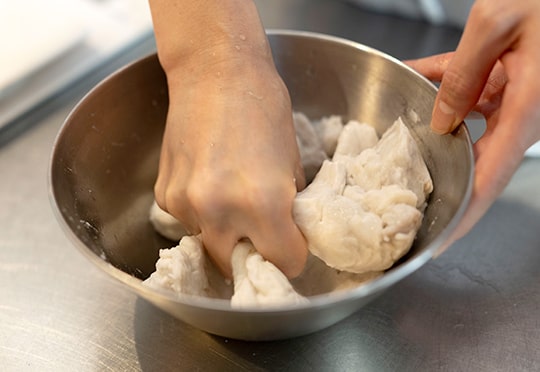 里芋は皮ごと茹でた後に、皮をむいてマッシュする。水を入れて硬さを調整し、塩で味をととのえる。椎茸はみじん切りにして、オリーブオイルで炒めて塩で味をととのえる。
