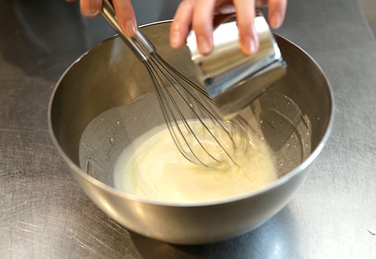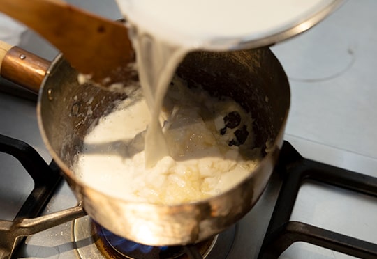 鍋にバターを入れ中火にかけ、溶けたらふるった薄力粉を加えて混ぜる。火が入ったら、温めておいた牛乳を3〜4回にわけて入れ、よく混ぜながらベシャメルソースをつくる。最後にブルーチーズ40gをちぎって加え混ぜる。