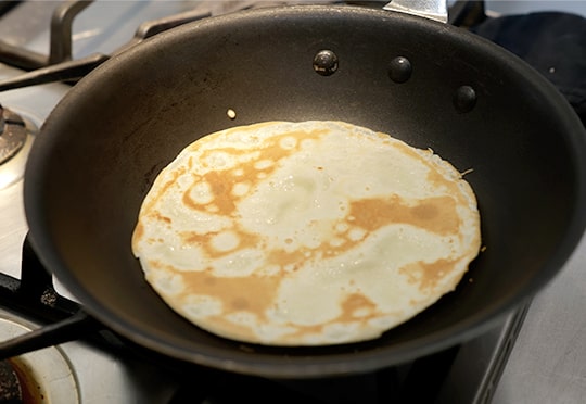 ①の生地をフライパンで焼いて4枚のクレープをつくる。