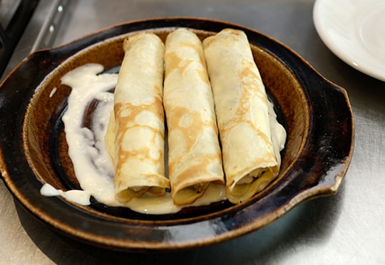 料理家 冷水希三子さんの小麦粉を使ったお料理レシピです。イタリアの家庭小麦料理を、冬らしく和の食材でアレンジ。もっちりとした薄焼きクレープ生地に、里芋のやさしい甘さと椎茸の旨みを閉じこめます。味わいの幅をひろげるブルーチーズがアクセント。とろりとした食感が心まであたためてくれる、季節のひと皿です。
