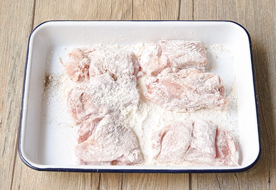 鶏もも肉を6等分に切る。塩・こしょうをし、薄力粉をまぶす。