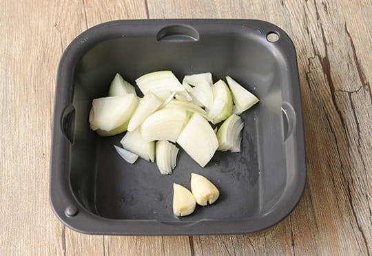 玉ねぎは横半分に切って2cm幅に切る。にんにくはつぶす。