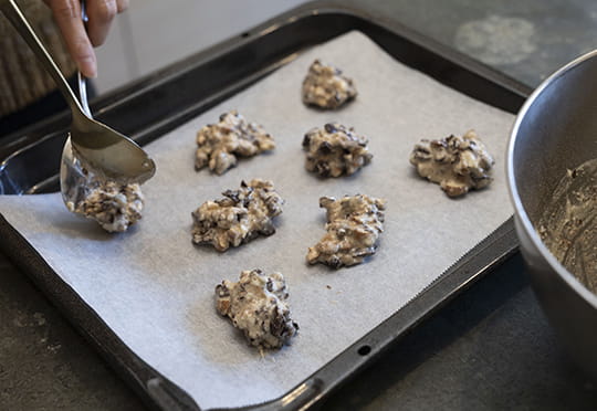 7. オーブンシートを引いた天板に⑥を一口大に落として、160度(ガスオーブンは150度)に予熱したオーブンで30分焼く。