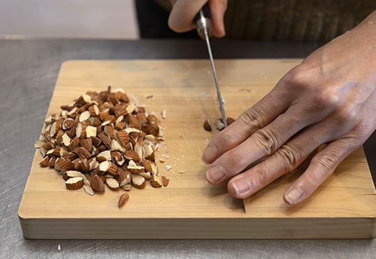 1. アーモンドは低温のオーブンでローストして(ローストアーモンドの場合この工程は不要です)、4~5等分のざく切りにする。