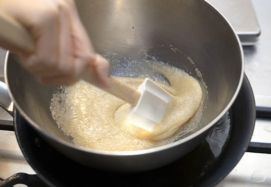 3. ボウルに卵白と砂糖を入れ、沸かない程度の温度(80度くらい)のお湯で湯煎しながら、砂糖の粒感がなくなるまでヘラで1~2分混ぜる。