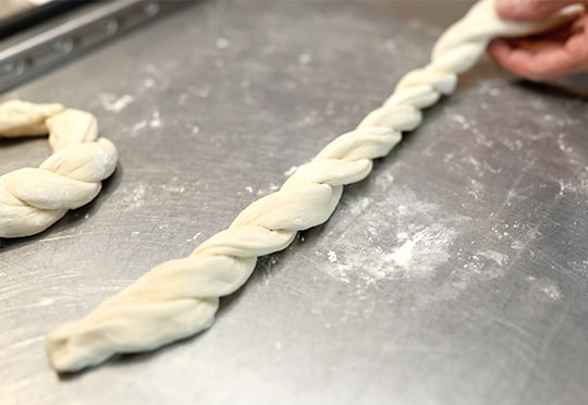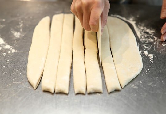 ②の生地に軽く打ち粉をふるい、同じく打ち粉をふるった台に取り出す。厚み1.5cmほどの長方形に伸ばし、縦に8等分する。