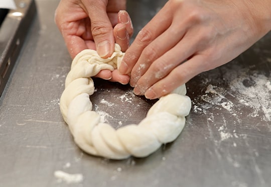 ③のうちの2本を持ち、片方の端をくっつける。ひねりながら巻きつけてロープ状に成型し、端と端をくっつけて輪っか状にする。これを4個分つくる。