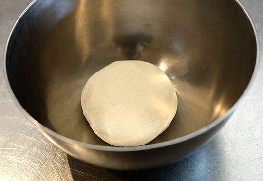 ボウルに準強力粉を入れ、その上に残りの<生地>の材料を、混ぜないよう順番にのせる。ドライイーストと砂糖をのせた付近にぬるま湯を加えてフォークで混ぜ、次第に全体を混ぜる。粉っぽさがなくなったら手でこね、ひとまとまりにして台に移す。さらに、なめらかになるまで5~10分ほどよくこねる。